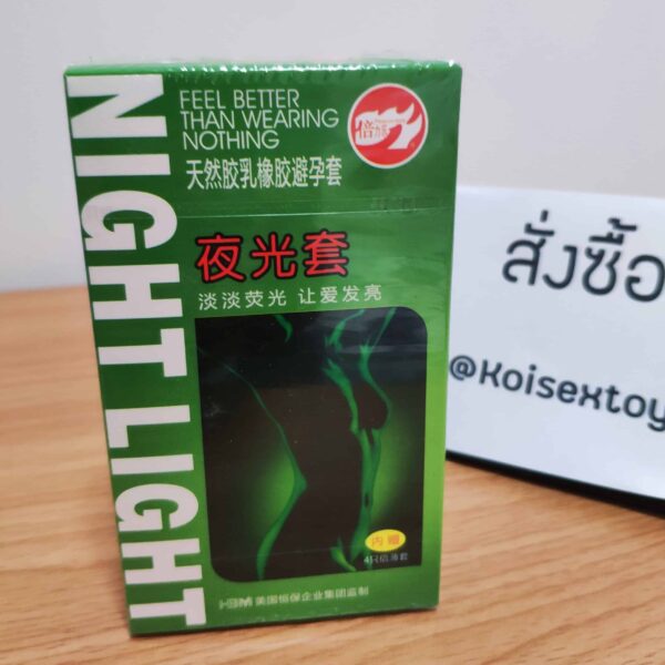 ถุงยางเรืองแสง Night Light ยี่ห้อ Night Light เป็นถุงยางที่ผลิตจากวัสดุธรรมชาติ เป็นถุงยางอนามัยชนิดพิเศษ เรืองแสงสีเขียวได้ในที่มืด มีความปลอดภัยในการใช้งานสูง ด้วยมาตรฐานการผลิตที่ได้รับการรับรองและตรวจสอบ GB7544-2009/ISO4074:2002 โดยถุงยางเรืองแสง Night Light จากออกแบบให้มี 3 ชั้น โดยชั้นกลางจะบรรจุเม็ดสีฟอสฟอรัสที่ทำคุณสมบัติเรืองแสง และชั้นนอกจะเป็นเนื้อยางพาราธรรมชาติประกบแบบแซนวิชนั้นเอง เหมือนกับถึงยางธรรมดาทั่วไป ที่จะอัดแน่นเป็นชิ้นเดียวกัน ไม่ทำให้รู้สึกหนาเทอะทะแน่นอน และยังได้รับรองมาตรฐานความปลอกภัยขั้นสูงอีกด้วยจากสหรัฐอเมริกา(FDA)